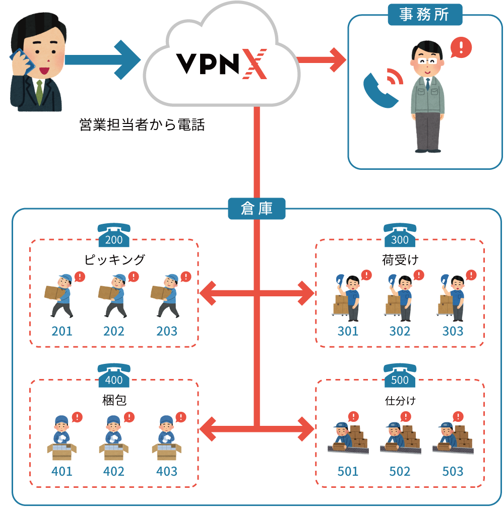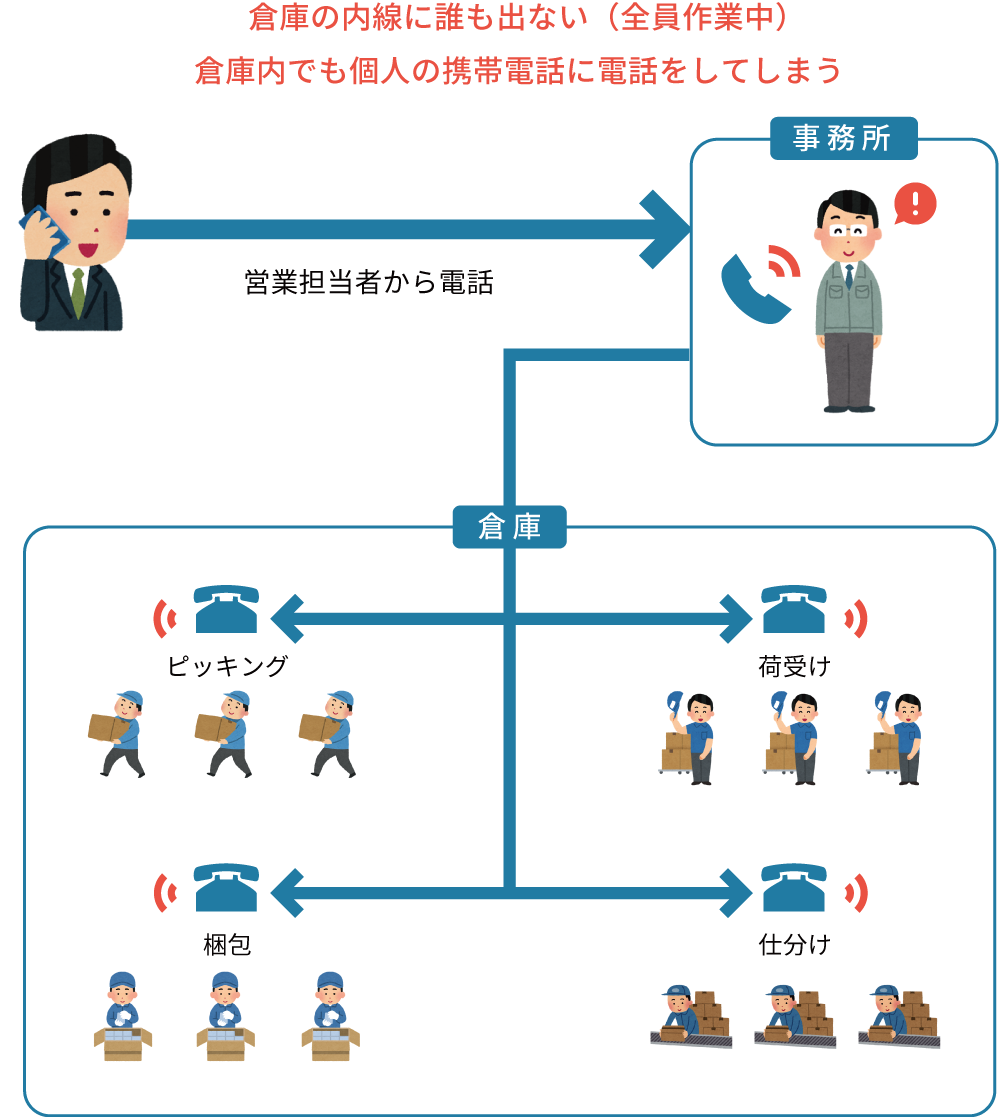 営業担当から倉庫に対して商品の出荷依頼をしようと、倉庫の事務所に電話を入れました。倉庫事務所の担当者は、再出荷の手配のため、「梱包」「仕分け」の部署の内線を鳴らします。しかし誰も出てくれないため、個人の携帯電話に電話をかけます。相手が電話に出てくれない場合、急ぎの要求に対応することができません。上記により、外線通話を使う為、通話料がかかります。また、個人の携帯番号を会社(組織)に伝えておく必要があり、その電話番号/情報の管理も考える必要があります。